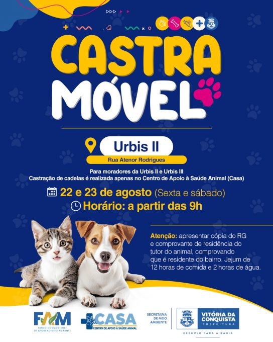 A unidade móvel do Centro de Apoio à Saúde Animal (Casa) estará na Rua Atenor Rodrigues, na Urbis 2, nesta sexta-feira (22) e sábado (23), para realizar castração em cães e gatos.