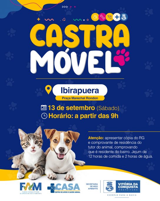 Atenção, moradores do Ibirapuera! Neste sábado (13), o Castramóvel realizará atendimento de cães e gatos, a partir das 9h, na Praça Marechal Rondon, em frente à Cincal.