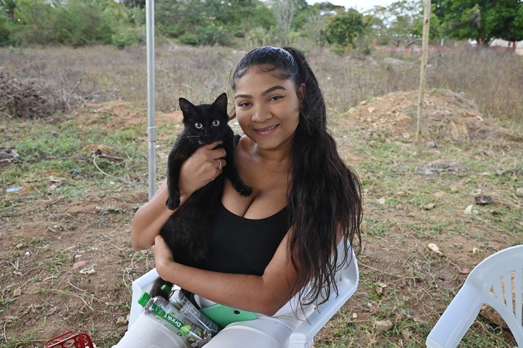 Tânia Silva cuida com muito amor do gatinho Calabreso desde o dia em que resgatou ele e a família. Os animais foram abandonados em um lata de lixo da localidade, mas foram acolhidos com muito amor por Tânia e o namorado. Os outros gatinhos fugiram, mas Calabreso ficou.