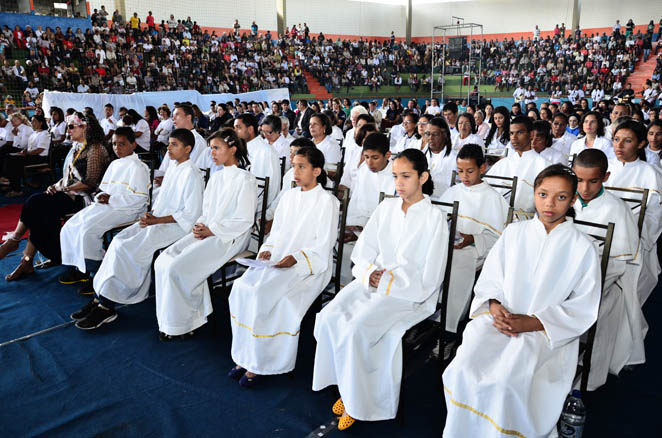 “É muito bom a gente ter uma religião na vida, e manter os filhos nela. Gosto muito de vê-los participando. É uma emoção sem explicação. É muito bom a gente ver os três lá no altar, como coroinhas, se engajando na igreja”, dizia ela, enquanto tentava fotografá-los. Maurília e os filhos moram no bairro Jurema, onde está sediada a Paróquia de Nossa Senhora Aparecida, responsável por promover a celebração realizada no Ginásio de Esportes.
