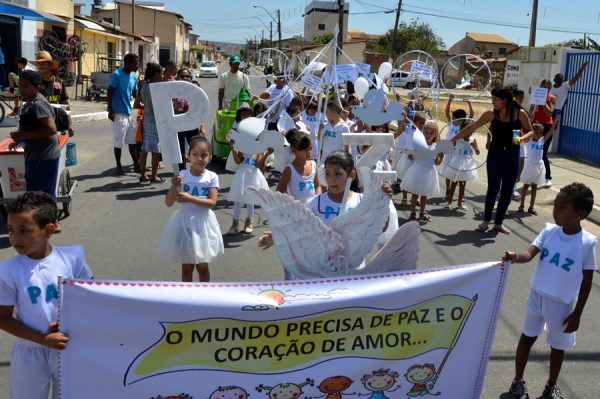 Nas alas, havia as tradicionais floristas, os esportistas e os personagens da literatura infantil. Encerrando o desfile, a turma de 5 anos levava a mensagem de paz. “O mundo precisa de paz e o coração de amor”, diziaa faixa da última ala, recitada no final da parada pela aluna Manuele que levou o símbolo da paz: “A pomba”, revelou a menina.