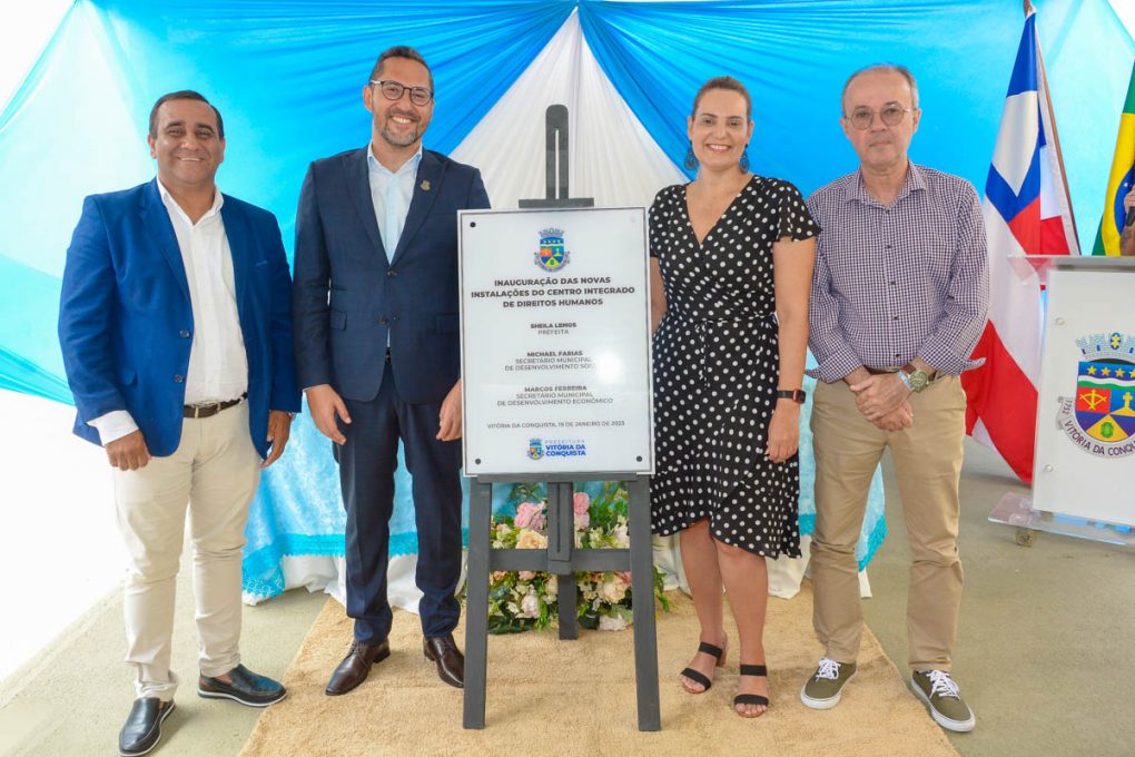 Prefeita Sheila Lemos, com os secretários municipais Michael Farias (Semdes) e Marcos Ferreira (SMDE), e o secretário da Câmara de Vereadores, Ricardo Babão (primeiro à esquerda)