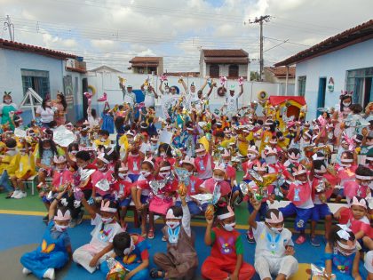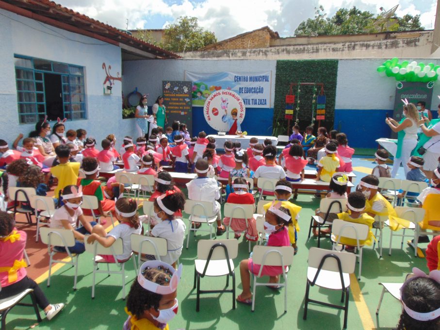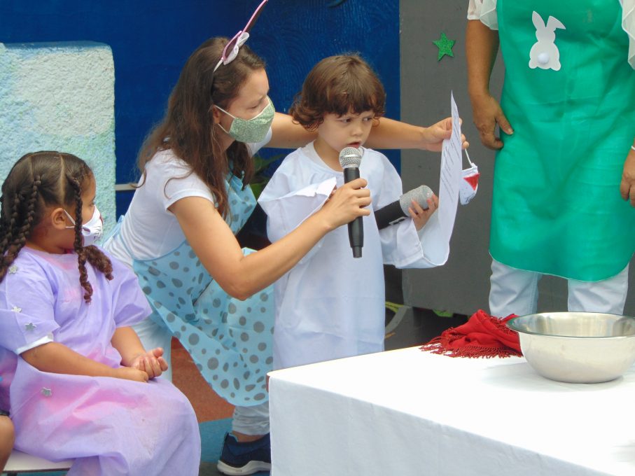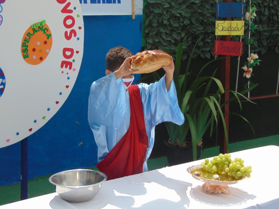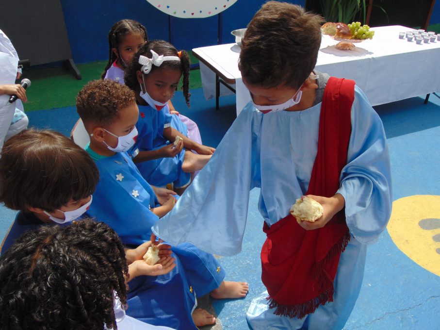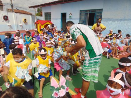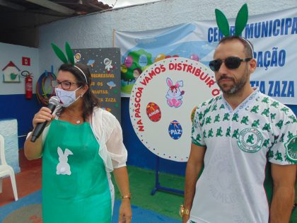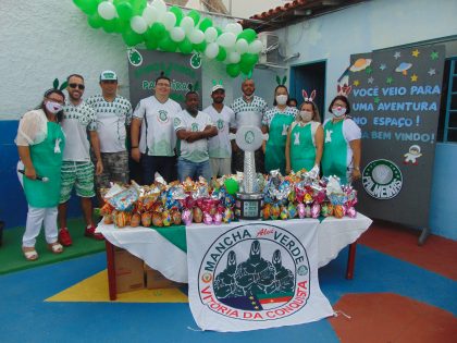 Com a participação da torcida uniformizada conquistense Mancha Alviverde do Palmeiras, que distribuiu 190 ovos de Páscoa para as crianças, o Centro Municipal de Educação Infantil (CMEI) Tia Zaza realizou, na manhã desta quarta-feira (13), uma programação especial em comemoração à Páscoa. A turma dos alunos de cinco anos fez uma encenação emocionante da última Páscoa comemorada por Cristo, quando foi instituída a celebração da Ceia.