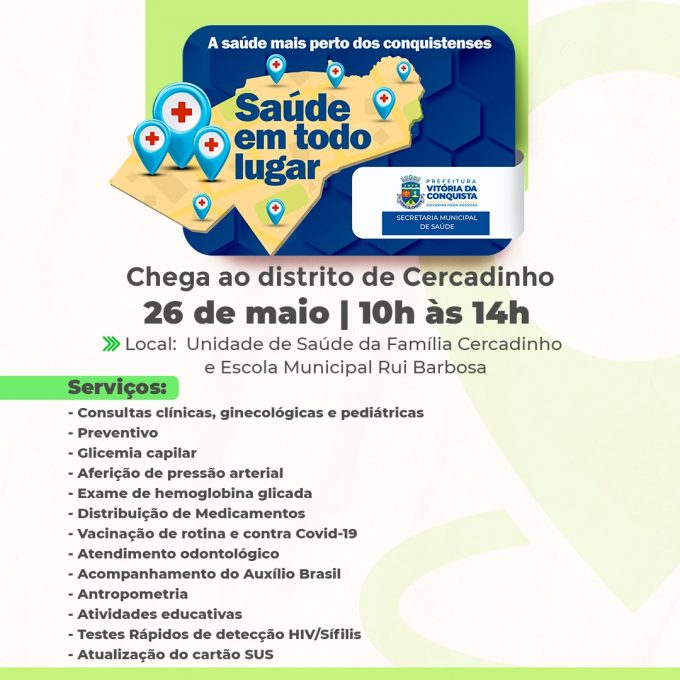 Mais uma ação do projeto Saúde em Todo Lugar, desenvolvido pela Secretaria Municipal de Saúde (SMS), será realizada, nesta quinta-feira (26), levando mais serviços de saúde para a população do distrito de Cercadinho, a 80 quilômetros da sede do município.