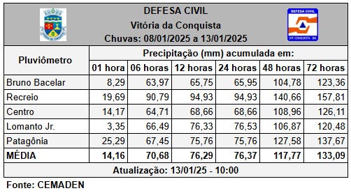 A chuva não cessa em Vitória da Conquista. O temporal, que atingiu o município na noite de ontem (12) durante toda a madrugada, causando danos em algumas localidades rurais, a exemplo do distrito de José Gonçalves, com alagamento de residências, e também na Zona Urbana, segue forte na manhã de hoje (13). Para se ter uma ideia, o volume médio de chuva acumulado nas últimas 72 horas saltou para 133,09, segundo a última atualização feita às 10h, pelo Cemaden.