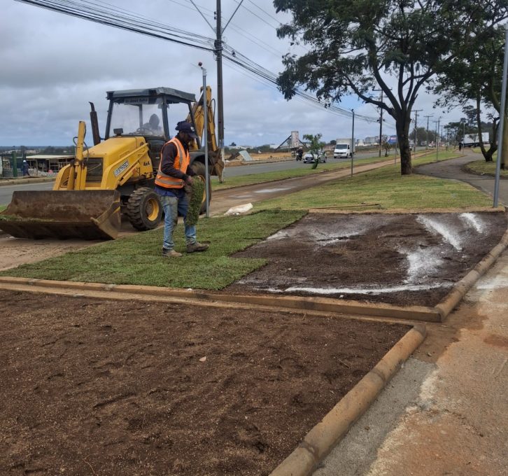 Já na Avenida Brumado, a obra continua com a segunda etapa da revitalização. Nesta quinta-feira (29), a Emurc aproveita as condições climáticas e realiza o plantio de grama no canteiro central.
