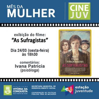 A Coordenação da Juventude realiza na próxima sexta-feira, 24, o primeiro Cinejuv do ano. O filme exibido será “As Sufragistas”, que retrata o início da luta do movimento feminista e os métodos incomuns de combate utilizados pelas inglesas. A mostra será realizada no Estação Juventude, às 18h30. Os comentários serão da psicóloga Ivana Patrícia.