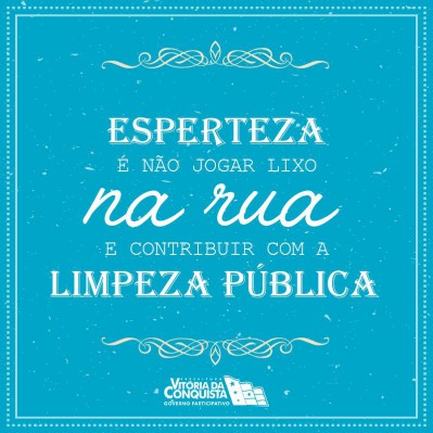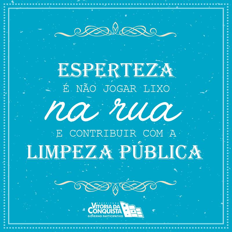 A Secretaria Municipal de Serviços Públicos conta com um programa regular de coleta de lixo que atende bairros, distritos e povoados da zona rural de Vitória da Conquista. Mas a conservação das vias públicas não é apenas uma competência da Administração Pública. É também dever do cidadão manter a cidade limpa.
