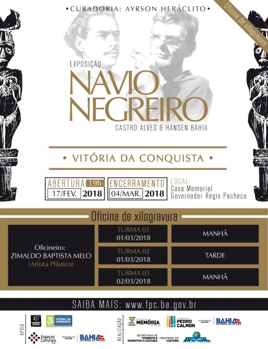 Entre os dias 17 de fevereiro e 4 de março, acontece no Memorial Régis Pacheco, localizado na Praça Tancredo Neves, a exposição “Navio Negreiro: Castro Alves e Hansen Bahia”. O trabalho tem o apoio da Secretaria Municipal de Cultura, Turismo, Esporte e Lazer e da Secretaria de Cultura do Estado da Bahia.
