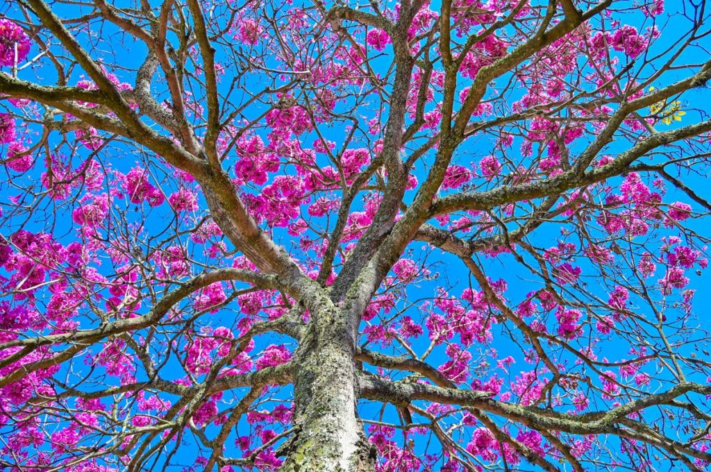 Cada variedade de ipê pode florescer em uma época. No final do inverno, por exemplo, quem se destaca é o ipê-rosa, que pode ser avistado de longe “irradiando” a paisagem ao seu redor com o púrpura de seus cachos de flores. Este fenômeno ocorre porque, ao perder as folhas, a copa da árvore fica exposta, permitindo que elas resplandeçam em contraste com a atmosfera mais acinzentada e típica dos dias mais frios.
