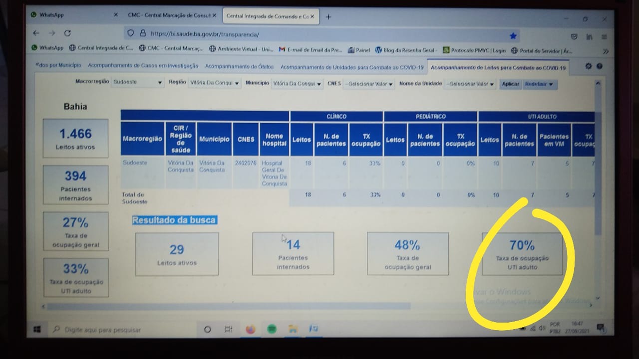 Com a queda nas internações, o Hospital de Clínicas de Conquista (HCC), contratado pelo Governo do Estado, já não consta da relação no painel online de Acompanhamento de Leitos Covid-19 da Secretaria de Saúde do Estado da Bahia (Sesab).