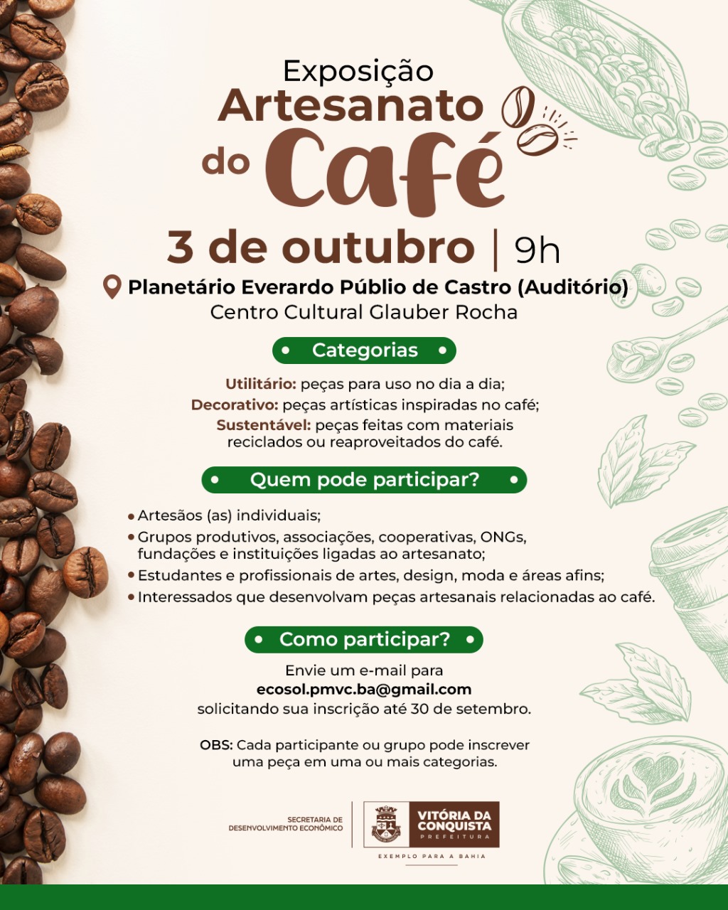 O projeto, aberto à comunidade cafeeira e a todos os interessados, visa expandir os conhecimentos e aproximar a população da cafeicultura, tão importante para a economia e a identidade de Vitória da Conquista e região. Haverá espaço para a apresentação do projeto, além de exposição de produtores da região, com palestras e degustação. Também será realizada a Exposição de Artesanato do Café, com artistas que desenvolveram peças inspiradas no café ou com materiais reciclados ou reaproveitados do café.