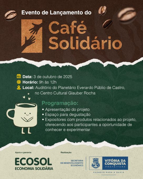 Nesta sexta-feira (3) será realizado o Projeto Café Solidário, uma iniciativa da Secretaria Municipal de Desenvolvimento Econômico (SMDE), por meio da Coordenação da Economia Solidária (ECOSOL). As atividades acontecem no auditório do Planetário Everardo Públio de Castro, no Centro Cultural Glauber Rocha, das 09h às 12h.