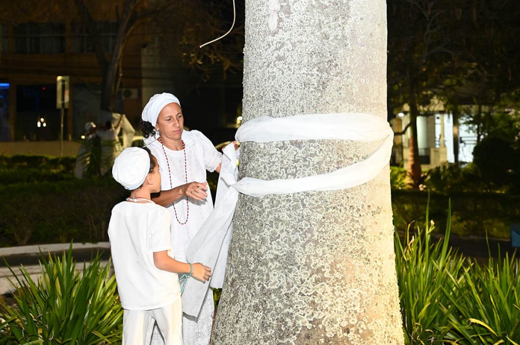 A cerimônia teve início com cânticos e toques de atabaques em saudação aos Orixás, pedindo licença e abrindo caminhos para a paz e o respeito entre as religiões. Em seguida, os participantes amarraram os ojás – tecidos brancos sagrados – nas árvores da praça, simbolizando a fé, a resistência e a proteção das religiões de matriz africana.