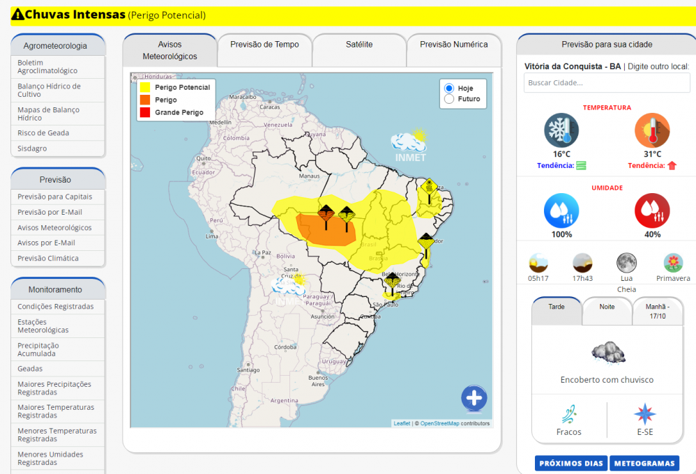 O Instituto Nacional de Meteorologia (Inmet) emitiu, nesta quarta-feira (16), um alerta amarelo que aponta “perigo potencial” para chuvas intensas. O aviso permanece até amanhã, às 10h, e compreende uma grande faixa do interior do país que se estende do Amazonas até o Sudoeste da Bahia, onde está localizado o município de Vitória da Conquista. A Prefeitura também está em alerta.