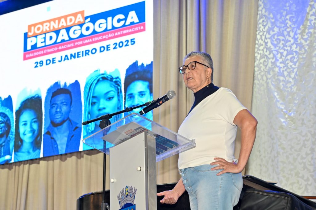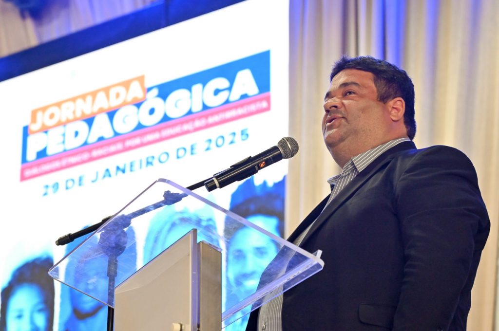 O secretário Edgard Larry destacou a escolha do tema da Jornada Pedagógica para chamar a comunidade escolar à reflexão sobre o racismo que ainda persiste na sociedade. “Temos hoje a oportunidade de discutir e até bater e refletir sobre a questão dos diálogos étnicos voltados especificamente para a condição do antirracismo. E aí nós tivemos a grande oportunidade, hoje, de ver e ouvir o nosso ilustre, o professor Nathanael do Santos, que demonstrou a importância grandiosa de desconstruir opressões, preconceitos. E é desta forma que a Secretaria Municipal de Educação vem de forma muito responsável colocar como ponto de pauta permanente a questão das discussões relativas ao racismo em nossa sociedade”.