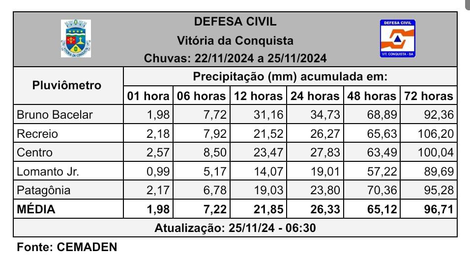 Desde a última sexta-feira (22), chove intensamente em Vitória da Conquista. De acordo com a atualização feita pela Defesa Civil, neste período, foi registrada uma média de 96,71 mm até as 6h30 de hoje (25). Nesse período, o Comitê de Crise da Prefeitura tem atuado em diversas frentes para sanar as ocorrências oriundas das fortes chuvas e diminuir significativamente o impacto das mesmas na infraestrutura da cidade.
