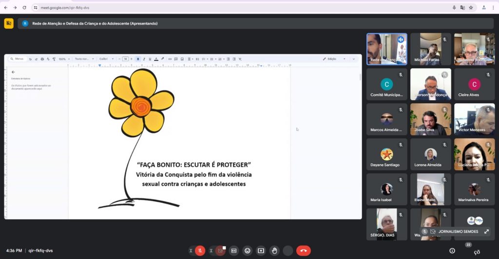 O encontro aconteceu por videoconferência e contou com a participação do consultor da Childhood Brasil, Prof. Benedito dos Santos, e representantes do Poder Executivo Municipal, do Sistema de Segurança Pública, do Sistema de Justiça, da Ordem dos Advogados do Brasil (OAB), do Conselho Municipal dos Direitos da Criança e do Adolescente (Comdica), das entidades não governamentais, do Núcleo de Defesa da Criança e do Adolescente (NDCA/Uesb) e dos Conselhos Tutelares de Vitória da Conquista.
