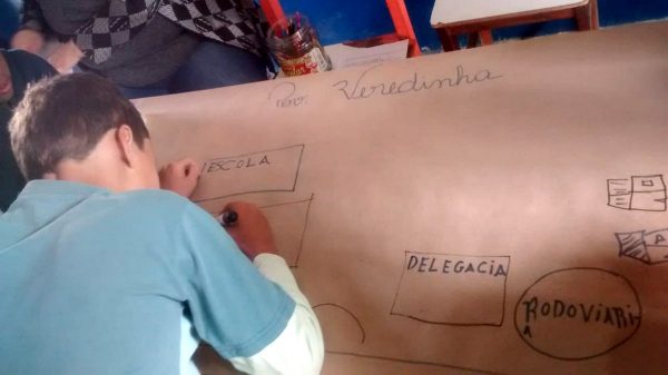 Nesta quarta-feira (25), as comunidades de Inhobim e Veredinha participaram da oficina e construíram o mapa falado de suas localidades. Durante a construção, os participantes expressam em desenhos e palavras como enxergam o lugar em que vivem, identificando cada um dos pontos como espaço de proteção, desproteção e/ou resistência.