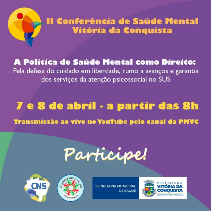 A II Conferência de Saúde Mental de Vitória da Conquista será realizada nesta quinta (7) e sexta-feira (8), por transmissão ao vivo noYoutube pelo canal oficial da Prefeitura, com o tema “A Política de Saúde Mental como Direito: Pela defesa do cuidado em liberdade, rumo a avanços e garantia dos serviços da atenção psicossocial no SUS”.