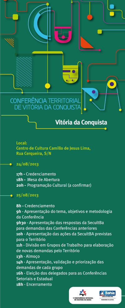 As Conferências Territoriais representam mais um importante passo para reunir os municípios baianos em torno de debates democráticos sobre políticas públicas de cultura em todo o estado. Elas serão realizadas em vários municípios da Bahia até o próximo dia 9 de setembro.