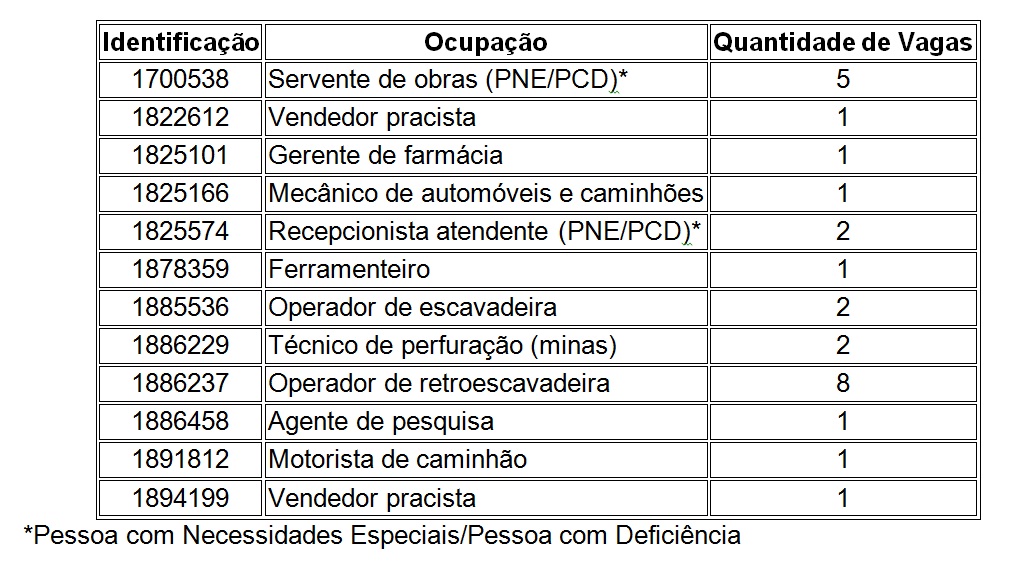 No total, são 26 vagas para diferentes profissões, como mecânico de automóveis e caminhões, operador de retroescavadeira, agente de pesquisa e vendedor pracista. E se você se interessou por alguma delas, não perca tempo e cadastre-se no Sine Conquista, que está localizado na Avenida Bartolomeu de Gusmão, nº 744, bairro Jurema.