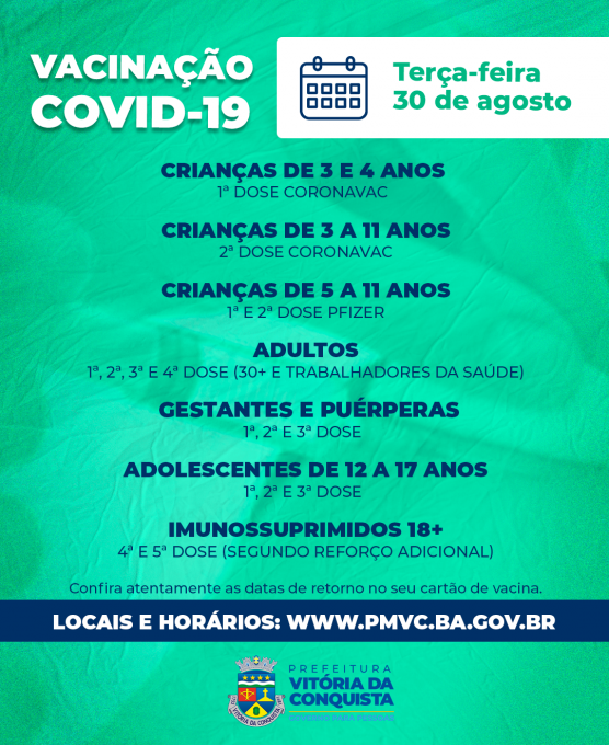 Nesta terça-feira (30), as unidades de saúde dão continuidade à vacinação contra a Covid-19, ofertando todas as doses para todos os públicos. O horário de funcionamento das salas de vacina é das 9h às 12h e das 14h às 16h30, exceto algumas delas que realizam a vacinação em horário diferenciado.