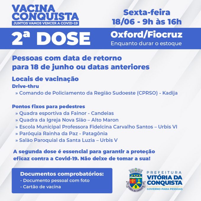 Quanto à 2ª dose da AstraZeneca/Oxford, prossegue na sexta a vacinação para quem tem data de retorno marca para o dia 18 de junho ou datas anteriores.