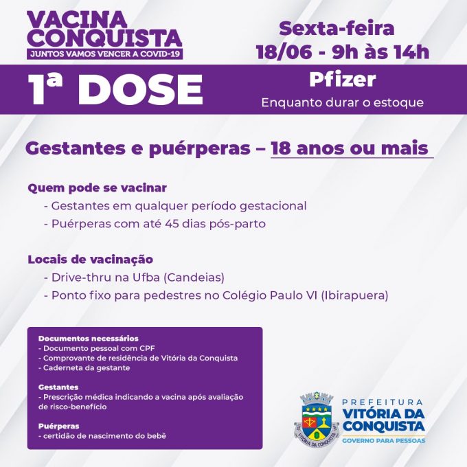 Como ainda não chegaram novas doses de vacina contra Covid-19 para atender os demais grupos prioritários com a 1ª dose, nesta sexta-feira (18), em Vitória da Conquista, só será realizada a vacinação das gestantes e puérperas, com 18 anos ou mais, utilizando o estoque disponível da vacina Pfizer recebido no início da semana e destinado, especificamente, para este público, de acordo com a Secretaria Municipal de Saúde (Sesab).
