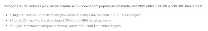 Em números totais, a Ouvidoria Geral de Vitória da Conquista só não conseguiu mais visualizações que a Agência Nacional de Vigilância Sanitária, que obteve 238.944 visualizações e garantiu o primeiro lugar na categoria 4, na qual foram alocadas as ouvidorias públicas vinculadas a municípios com mais de 500 mil habitantes, a estados, ao Distrito Federal e a órgãos federais.