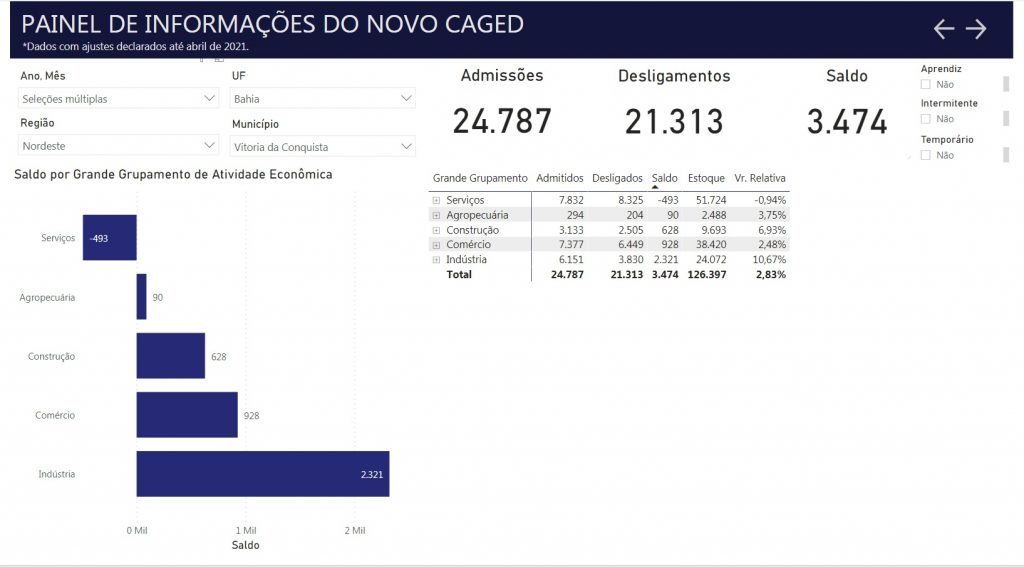 Vitória da Conquista voltou a ser destaque no cenário econômico da Bahia com geração de empregos em meio à pandemia do novo coronavírus. Considerando o período de março de 2020 a abril de 2021, o município ocupa o segundo lugar no estado da Bahia, com saldo positivo de 3.474 novos empregados com carteira assinada, atrás apenas de Lauro de Freitas em números absolutos. Os dados são do Cadastro Geral de Empregados e Desempregados (Caged), da Secretaria do Trabalho, ligada ao Ministério da Economia.