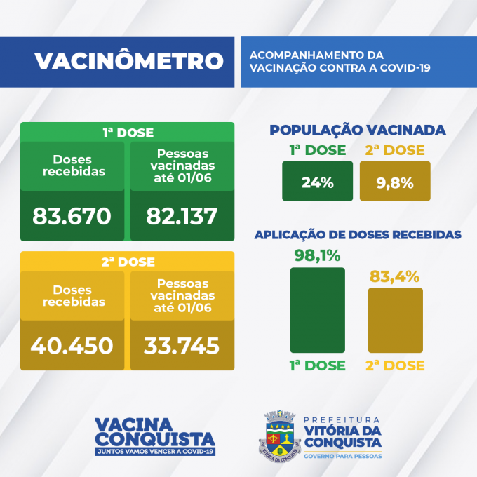 O município está trabalhando para vacinar a sua população o mais rápido possível, à medida que tem recebido novas remessas de vacinas. Até ontem (1º), 82.137 conquistenses foram vacinados com a 1ª dose, o que representa 24% da população. Enquanto 33.745 receberam a 2ª, com um percentual de 9,8%, de acordo com a estimativa do IBGE.