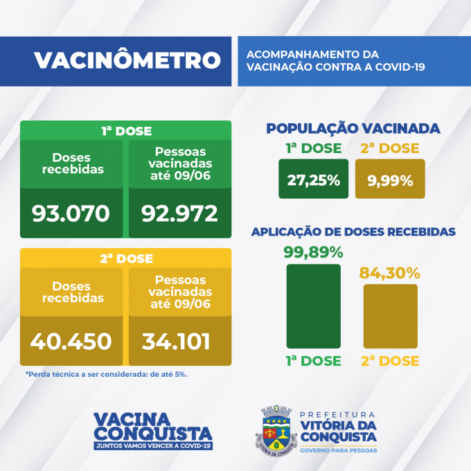 Neste momento, a vacinação segue suspensa nos pontos fixos, pois já foram utilizadas 99,8% das doses enviadas pelo Governo do Estado. A Secretaria Municipal de Saúde aguarda o recebimento de uma reposição para continuar vacinando os grupos prioritários. O estoque restante está sendo usado para vacinar acamados, doentes domiciliados e da zona rural de Vitória da Conquista.