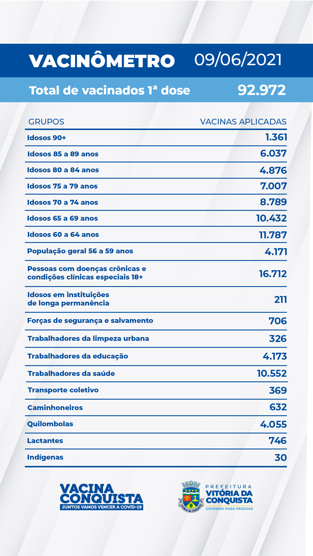 A Secretaria Municipal de Saúde (SMS) vacinou, do dia 19 de janeiro até ontem (8), 92.972 pessoas com a 1ª dose da vacina, equivalente a 27,2% da população, com base na estimativa do IBGE/2020. E já receberam a 2ª dose 34.101 pessoas, ou seja quase 10% da população já foi imunizada contra o novo coronavírus.
