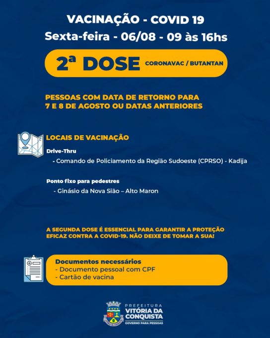 SEGUNDA DOSE – Nesta sexta-feira (6), também haverá aplicação da 2ª dose de Coronavac/Butantan e AstraZeneca/Fiocruz, sendo divididas por pontos e horário. A 2ª dose Coronavac/Butantan será aplicada das 9h às 16h no drive-thru no Comando de Policiamento da Região Sudoeste (CPRSO), no Kadija, e no ponto fixo para pedestres do ginásio da Nova Sião, no Alto Maron.