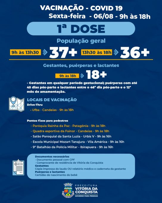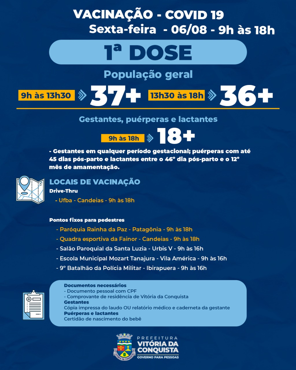 Com 4.852 doses recebidas hoje, a Secretaria Municipal de Saúde (SMS) vai realizar a vacinação da 1ª dose, nesta sexta-feira (6), para a população em geral de 37 e 36 anos ou mais. Das 9h às 13h30, serão vacinadas as pessoas com 37 anos ou mais, e, das 13h30 às 18h, as pessoas com 36 anos ou mais. Também poderão se vacinar gestantes, puérperas e lactantes de 18 anos ou mais, das 9h às 18h.