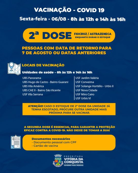 Já a 2ª dose AstraZeneca/Fiocruz estará disponível das 8h às 12h e das 14h às 16h, nas seguintes unidades de Saúde: UBS Panorama, UBS Hugo de Castro (bairro Guarani), UBS Vila América, UBS CAE II (São Vicente), USF Vila Serrana, USF Jardim Valéria, USF Conveima, USF Solange Hortélio (Urbis II), USF Nova Cidade, USF Urbis VI e USF Miro Cairo.