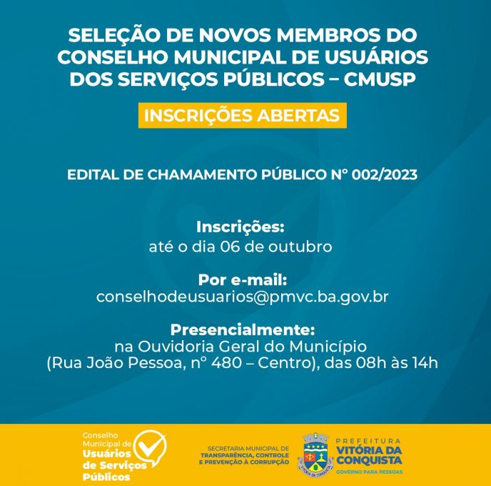 Serão disponibilizadas 16 vagas para o Conselho Municipal de Usuários dos Serviços Públicos entre titulares e suplentes. A seleção será composta por duas etapas. Além da verificação da documentação e das condições de admissibilidade ao processo, será realizado sorteio no dia 18 de outubro de 2023, na presença de todos os membros da Comissão de Seleção.