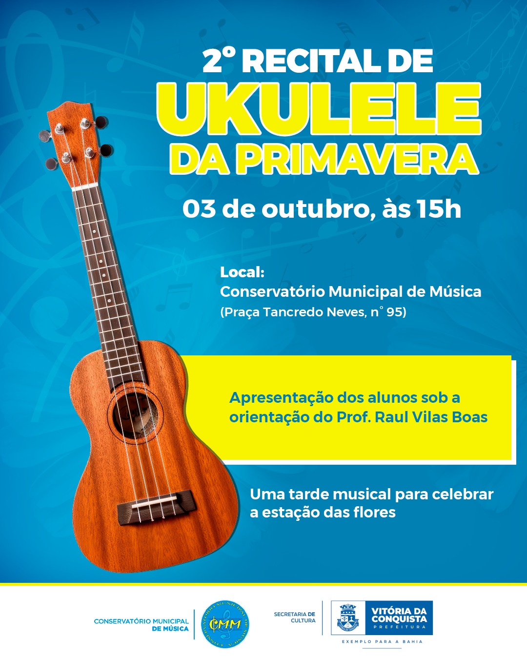 Na próxima sexta-feira (3), o Conservatório Municipal de Música realizará o 2º recital de Ukulele da Primavera, a partir das 15h. A apresentação será realizada pelos alunos do curso de ukulele do conservatório, sob a regência do professor Raul Vilas Boas.