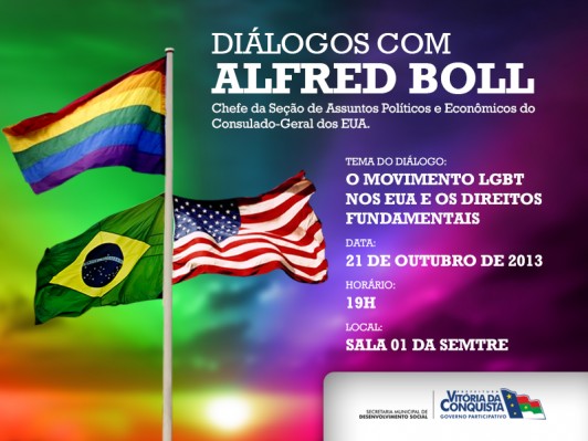 Na ocasião, o cônsul também vai participar de diálogos sobre “O Movimento LGBT nos EUA e os Direitos Fundamentais”. Esses diálogos serão realizados na Secretaria Municipal de Trabalho, Renda e Desenvolvimento Econômico/Semtre, às 19h, e contarão com a participação de representantes do Movimento Social LGBT da região.