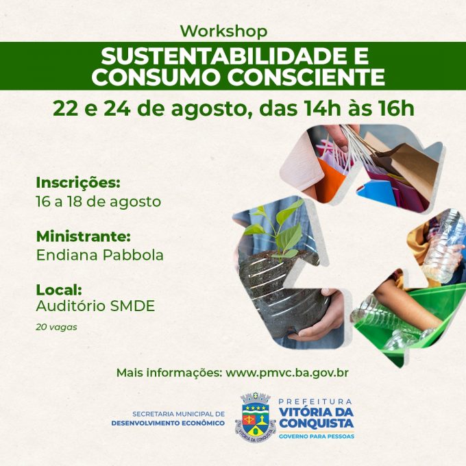 Já estão abertas as inscrições para o workshop “Sustentabilidade e Consumo Consciente”, promovido pela coordenação da Juventude, ligada à Secretaria Municipal de Desenvolvimento Econômico (SMDE).