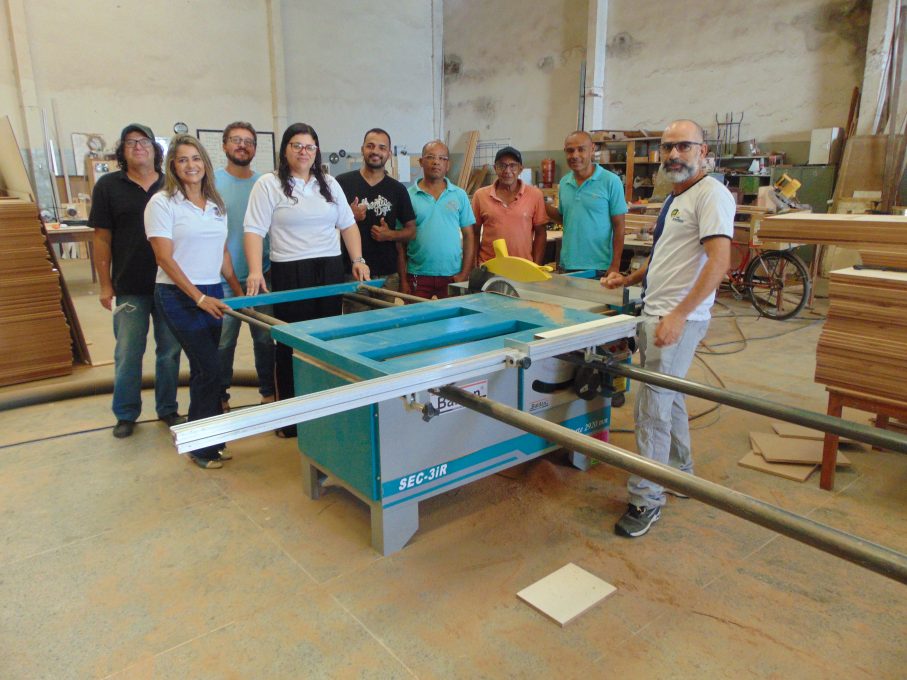 As coordenadoras Nélia Oliveira e Ana Cristina e a equipe da marcenaria com a nova serra circular esquadrejadeira