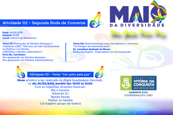 Maio da diversidade –A coordenação LGBT promove, ainda este mês, outras atividades voltadas à conscientização LGBT. Confira a programação: