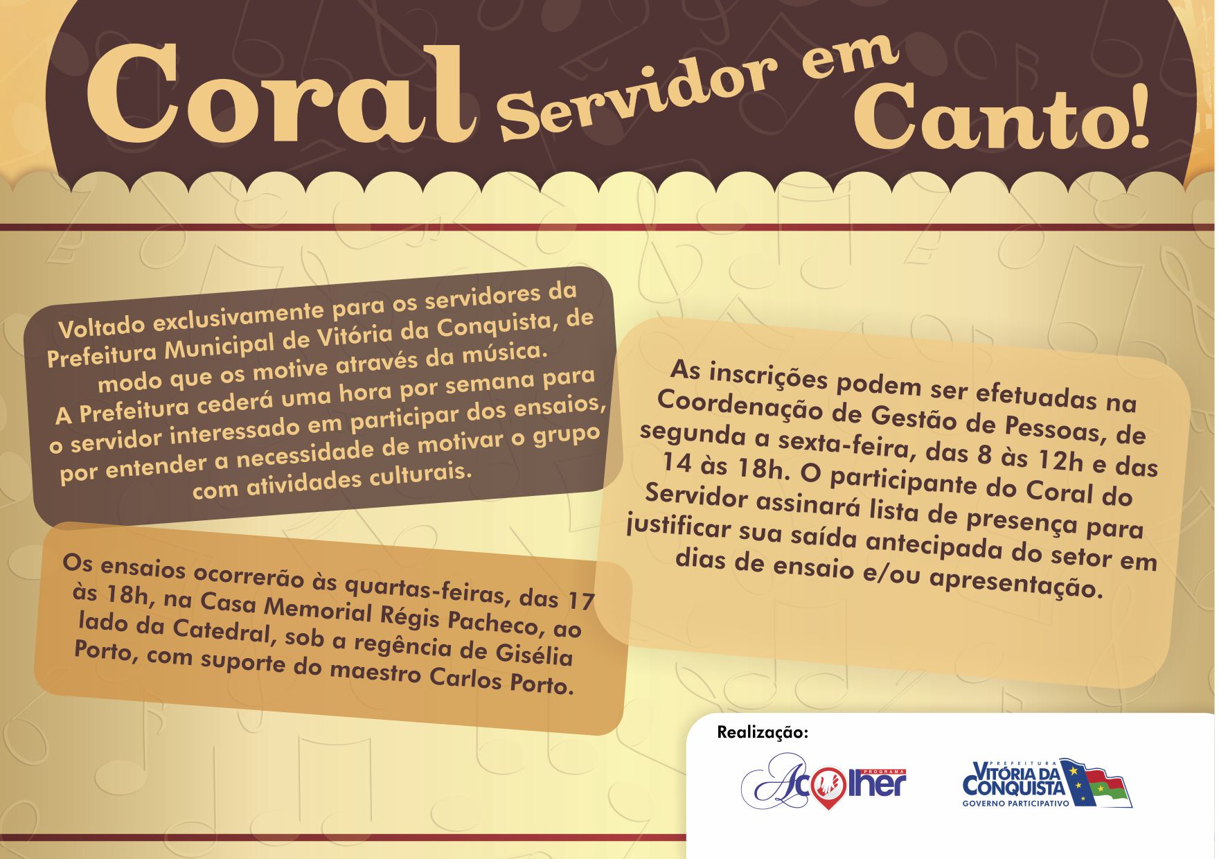 Quem ainda não se inscreveu para participar do Coral dos Servidores, ainda dá tempo. Os servidores que desejarem participar do coral deverão se dirigir à Coordenação de Gestão de Pessoas, de segunda a sexta-feira, das 8 às 12h e das 14 às 18h para efetuar a inscrição.