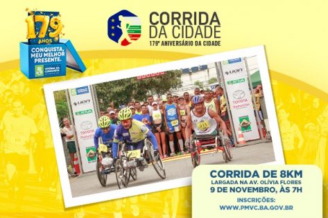 Atenção, corredores! Nesta terça-feira (29), às 19h, as inscrições para a “Corrida da Cidade” estarão disponíveis de forma gratuita. São 500 vagas. Promovida pela Prefeitura de Vitória da Conquista em celebração aos 179 anos de emancipação do município, a prova será realizada no dia 9 de novembro, dia do Aniversário da Cidade.