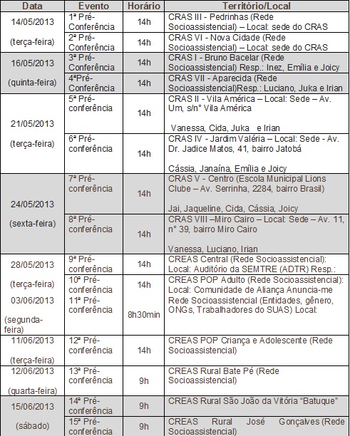 Na oportunidade, a comunidade, entidades e organizações da sociedade civil e conselheiros do CMAS, avaliaram os serviços e benefícios da assistência social e tiveram a oportunidade de apresentar propostas para a maior efetivação da participação e do controle social. As 15 pré-conferências abordam o mesmo tema da 8ª Conferência Municipal de Assistência Social,“A Gestão e o Financiamento na efetivação do SUAS”, que acontecerá nos dias 10 e 11 de julho.
