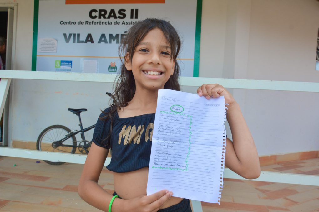 Lívia Vitória Viana, de 10 anos, ficou tão feliz com a festa organizada pela equipe do Cras que resolveu expressá-la em forma de poema: “Ser criança é alegria, é muita fantasia/ Ser criança e muita brincadeira/ Eu tomo banho e faço castelo de Areia/Eu amo ser criança/ Eu como doces e encho a pança/Nós crianças devemos amar a quem nos ama/ Porque o amor é um sentimento bacana/ Viva o dia das crianças”.