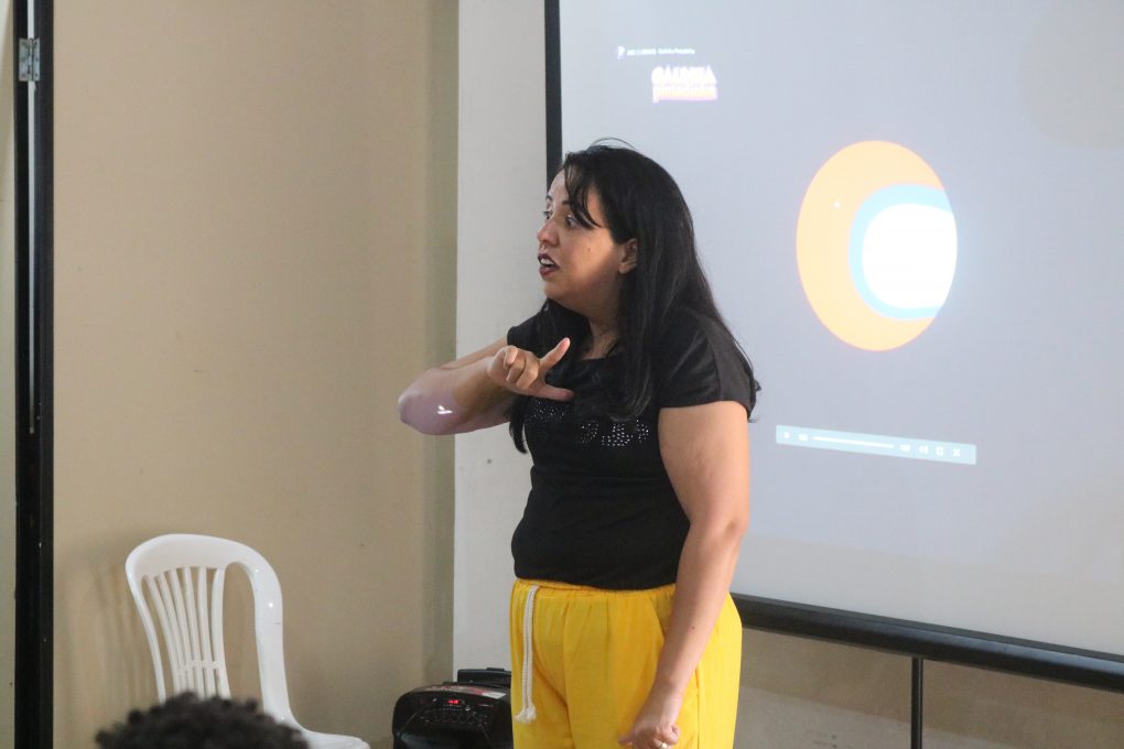 Durante as atividades, a intérprete Renata Lima compartilhou suas experiências com os jovens. Casada com um deficiente auditivo, Renata atua como intérprete há mais de 5 anos. “Para mim, é muito gratificante poder compartilhar meus conhecimentos e promover a inclusão por meio da comunicação. Espero que essa aula tenha despertado nos participantes, o interesse e a sensibilidade para a importância da Libras na inclusão social”, relatou Renata.