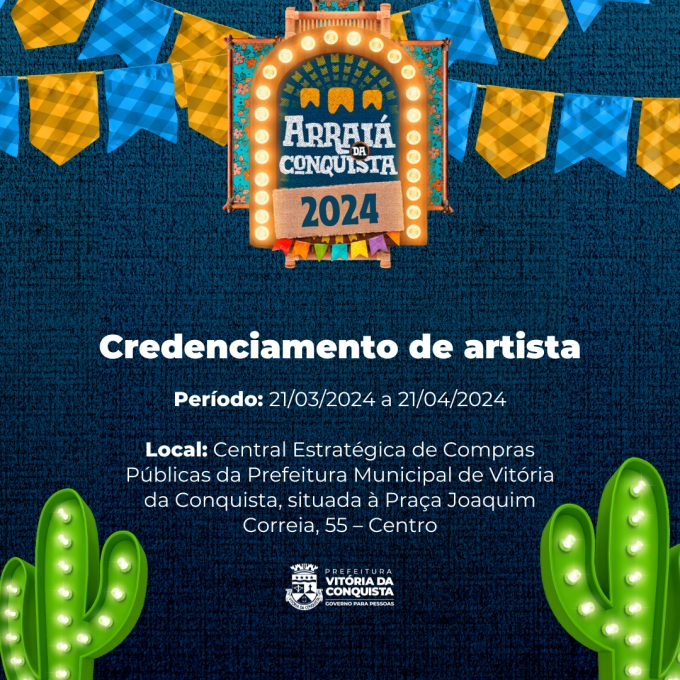 A Prefeitura de Vitória da Conquista publicou no Diário Oficial do Município o aviso de chamamento dos artistas que desejam se apresentar no Arraiá da Conquista 2024. A Secretaria Municipal de Cultura, Turismo, Esporte e Lazer (Sectel) vai selecionar até 55 projetos artísticos divididos em seis categorias, disponibilizando cachês que variam de R$ 3 mil a R$ 15 mil.