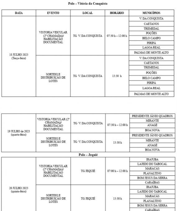 Em Vitória da Conquista, o credenciamento será no Tiro de Guerra 06-006, localizado na praça Sá Barreto, s/n, Centro. Existem 16 lotes no município, o que totaliza 11 mil pessoas contempladas pela operação. Além disso, por meio da Secretaria Municipal de Desenvolvimento Rural (SMDR), o município mantém, com recursos próprios, 10 caminhões-pipa em atividade nas regiões que não são atendidas pela Operação Carro-Pipa. A Coordenadoria Municipal de Proteção e Defesa Civil também vai iniciar, nos próximos dias, novos roteiros de abastecimento com outros dois caminhões, graças a um convênio firmado com o Governo Estadual, através da Superintendência Estadual de Proteção e Defesa Civil.